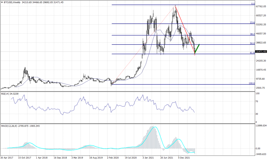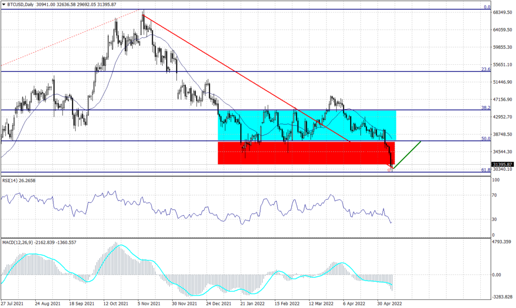 The Bitcoin at 10 months low as it lost 56% since November 2021 when started the decline from $68,960 landing today at a low of $29,742. However, BTCUSD decline was expected but the geopolitical conflict in Eastern Europe pressured the Bitcoin to the lowest price in ten months.