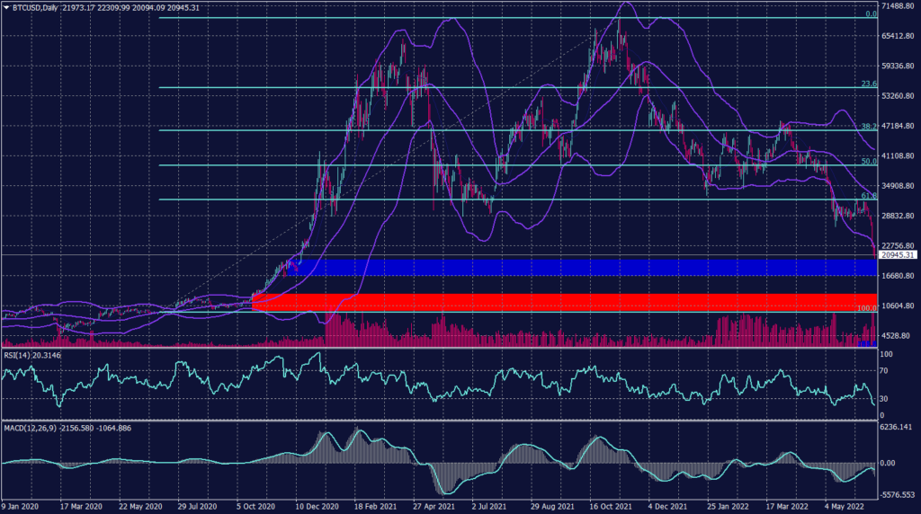 The volume of trading and sell-off is pressuring the Bitcoin towards the range between 12,500 and 10,000 (the red range). Furthermore, the 55 days moving average retains its negative signals and indicates resistance at $29,300. However, the Bollinger Bands signal a possibility of a corrective bounce from between $19,000 and $21,000. Meanwhile, RSI show overselling of BTCUSD and reads below 20 and BTCUSD below $20,000 while the MACD signals further decline and are heading towards $18,500 in the short term.