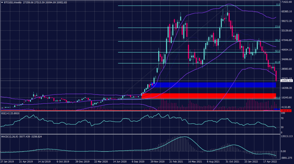 The leading cryptocurrency fell below its 18 months low, reaching a critical range between $20,000 and $16,000 (the blue range), which is supposed to absorb the momentum and slow down the fall. However, in the most probable scenario, the support range will not be enough to stop the fall, especially if the price falls below $18,400.
