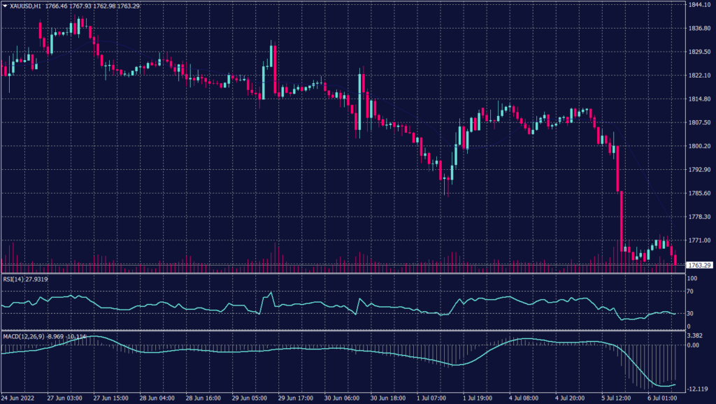 Gold continued the decline below $1,764 per ounce this morning in Asia. Gold broke below the support at $1,800 and didn’t stop until the emotional support at $1,764. The daily chart, however, show a continuation of the negative trend towards $1,750.