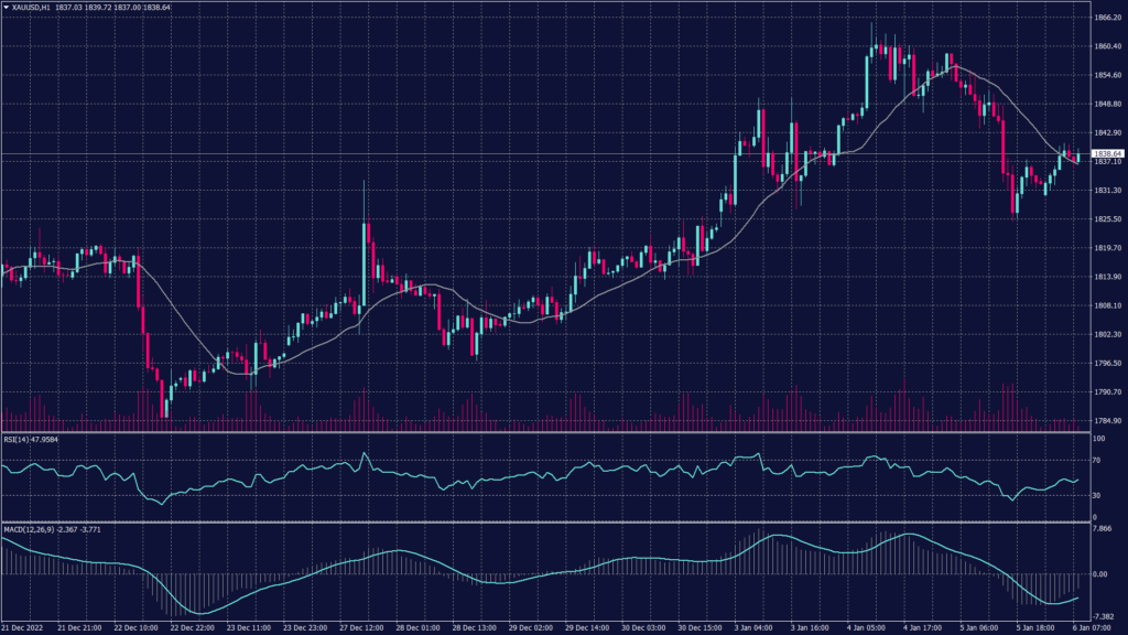 Spot gold daily chart shows a continuation of the uptrend while the hourly chart shows fluctuations between 1,840 and 1,850. On the hourly chart, RSI shows overbuying and signals a possibility of a decline to relieve the buying pressure, meanwhile, the MACD intersects with the moving average and signals a divergence and a slight decline.