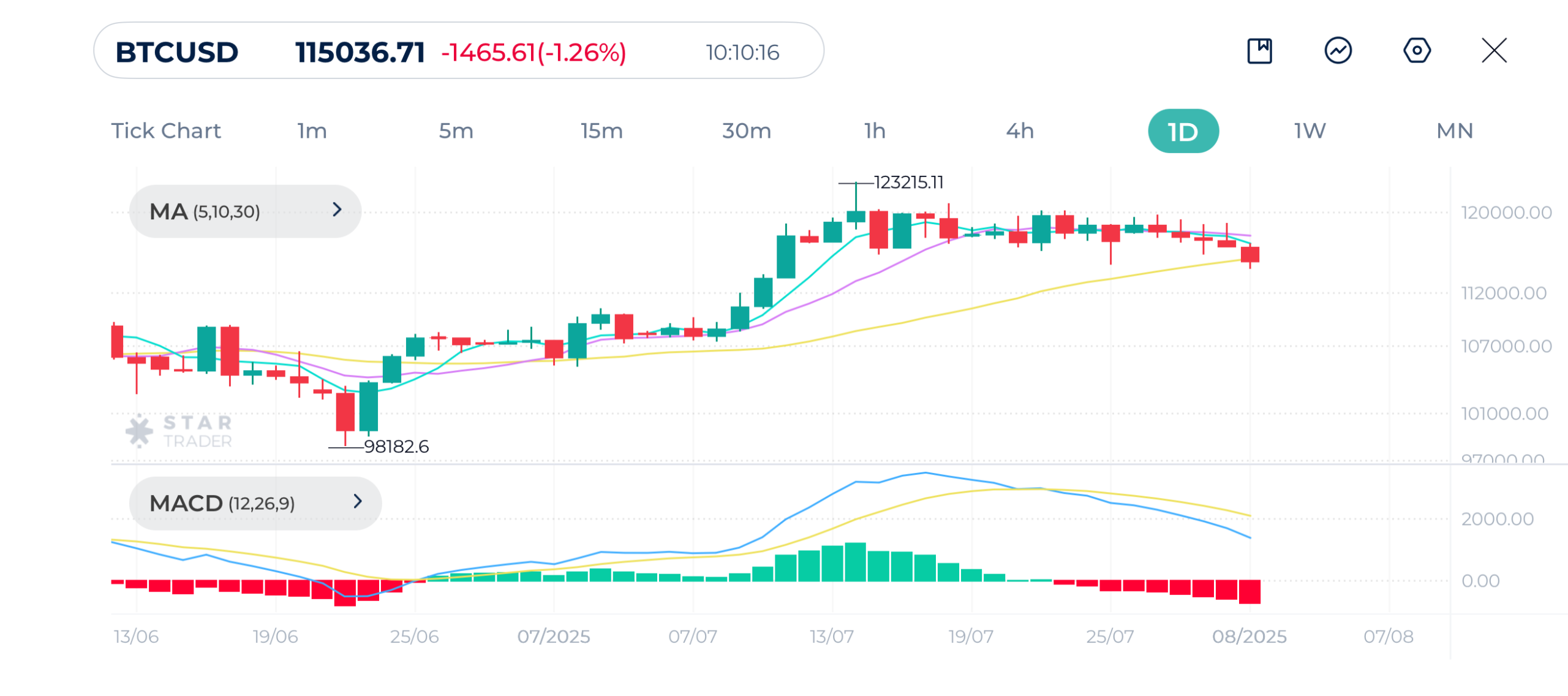 Price is making lower highs and lower lows on the daily chart since reaching the all-time high above $123,000 Price recently broke below moving averages MA(5) and MA(10), and now testing the MA(30) which acts as a dynamic support level around $115,000. If price closes below this level on the daily chart, acceleration toward psychological $110,000 level is possible.