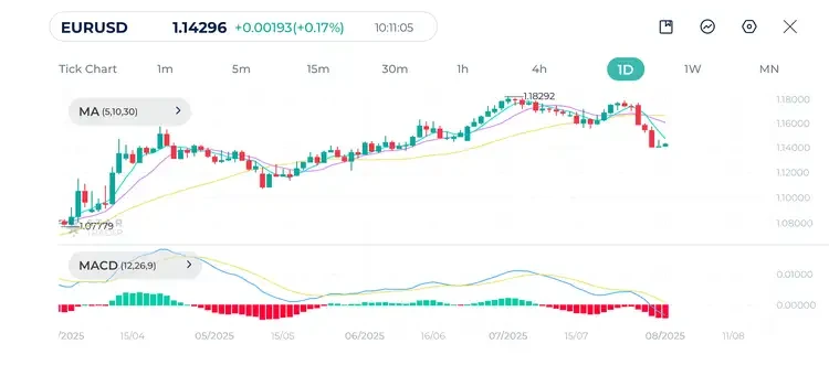 Bearish crossover with moving averages MA(5), MA(10) and MA(30) is seen on the daily chart. Price is well below all three moving averages, which suggests strong selling pressure. MACD shows bearish crossover indicating accelerating downside momentum. Overall, the pair is currently in a short-term downtrend within a broader uptrend. If price doesn’t hold above 1.1380, we might see further declines toward 1.1300 and later 1.1220 levels