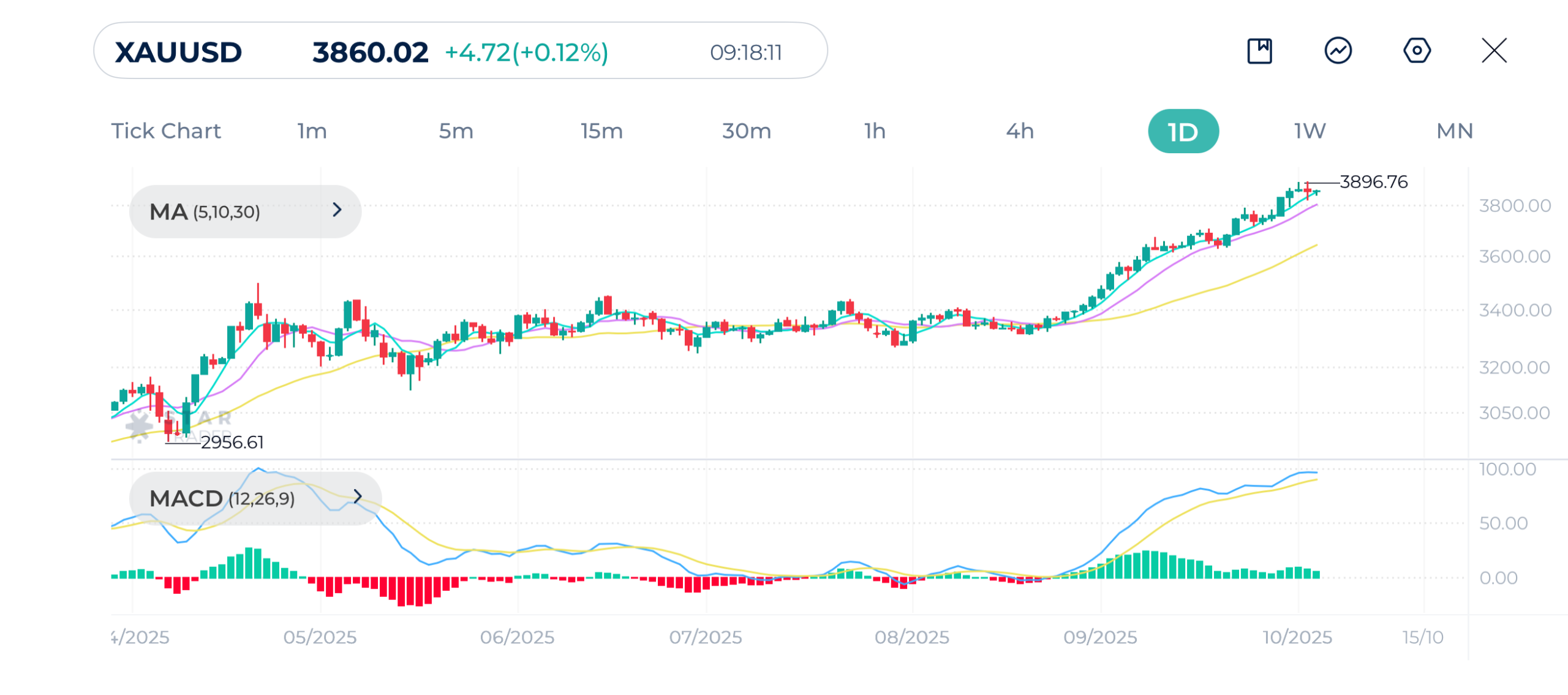Gold prices show the continuation of a significant and accelerating rally on the daily chart. The recent price action shows the market tightly tracking the moving averages MA(5) and MA(10), a clear sign that buyers are stepping in quickly to prevent any meaningful corrections.