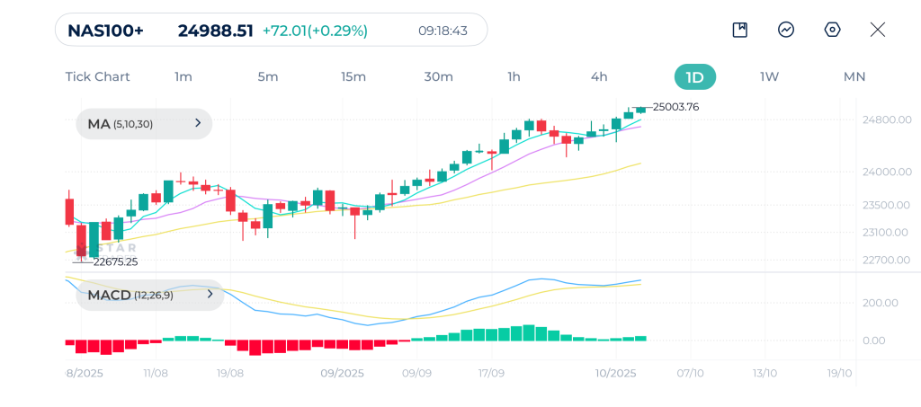 Nasdaq 100 shows a clear uptrend on the daily chart, as prices push toward the recent high of 25,000. The price action shows a consistent pattern of higher highs and higher lows.