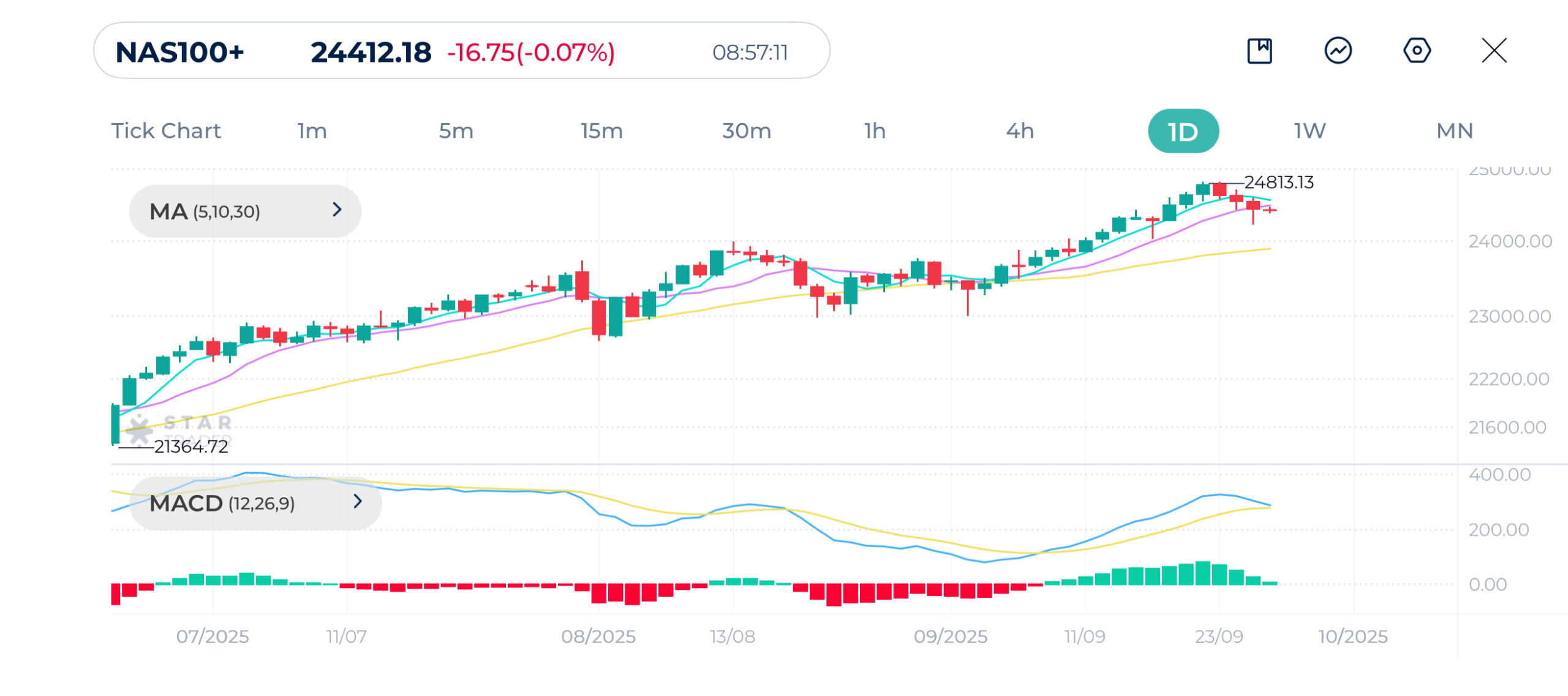 Nasdaq is still in a strong uptrend from 21,360 in June to 24,800 in September. Recent candles show rejection at highs.