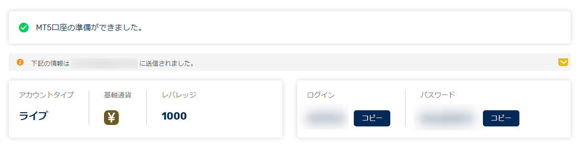 FXGTからは「MT5口座作成完了」と書かれたメールが届きます。