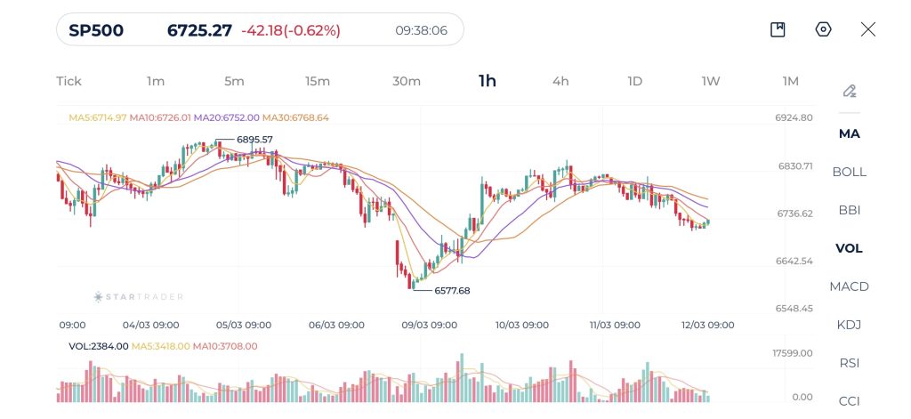 S&P500は現在 6,725〜6,800付近で推移しています。指数は一時 6,577付近まで急落しましたが、その後は V字型の反発となり、現在は6,800付近でのもみ合いとなっています。