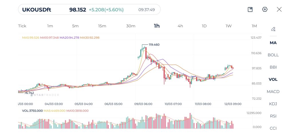 ブレント原油は現在 98.15ドル付近で推移しています。原油価格は 80ドル台半ばから110ドル台まで急騰する強い上昇局面を経た後、足元では調整局面に入っています。
