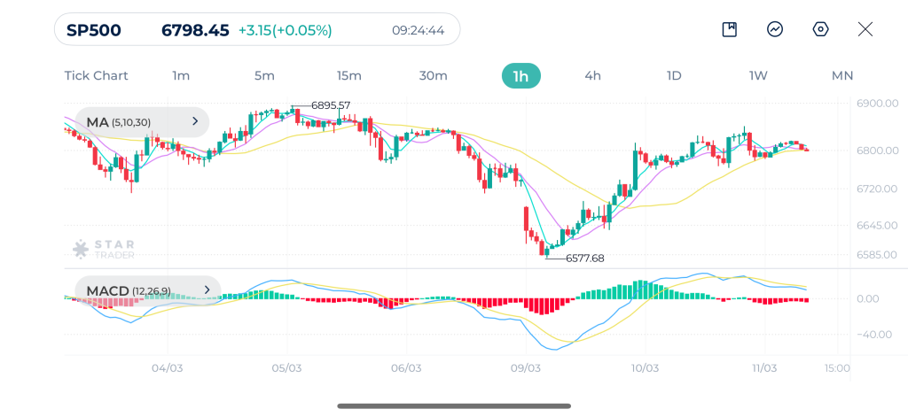 S&P500は現在 6,800付近で推移しています。月曜日に 6,577付近の強いサポートゾーンから反発した後の値動きです。この動きは、短期的に買い手が主導権を一部取り戻したことを示唆していますが、依然として明確な上昇トレンドの継続には至っていません。
