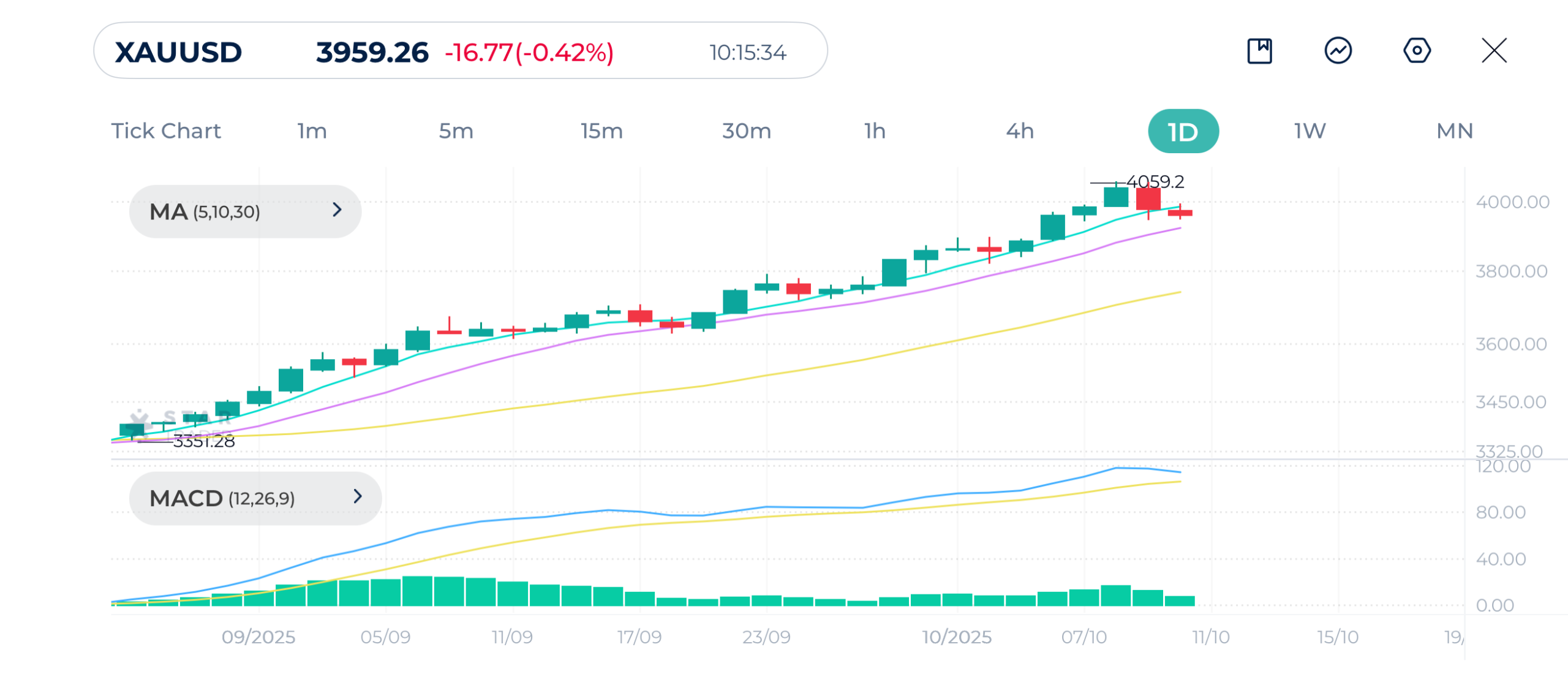 金価格(Gold)は8週連続で上昇を続け、今週ついに史上最高値4,059ドル($4,059)を突破した。日足チャートでは、明確な高値更新(Higher Highs)と安値切り上げ(Higher Lows)のパターンを形成しており、強い上昇トレンドを維持している。