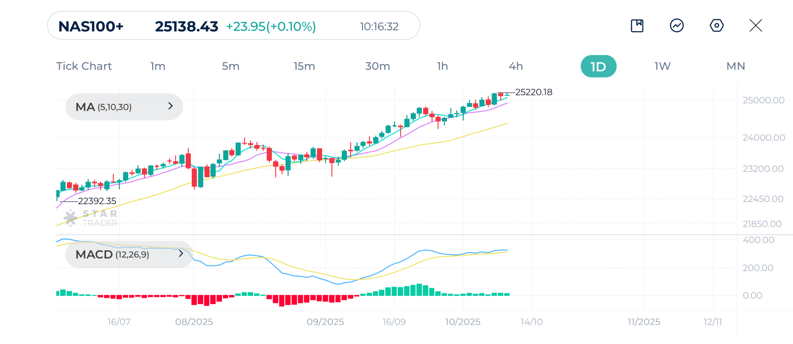 ナスダック100指数(Nasdaq 100)は強い上昇トレンドを維持しており、10日移動平均線が継続的にサポートとして機能している。
