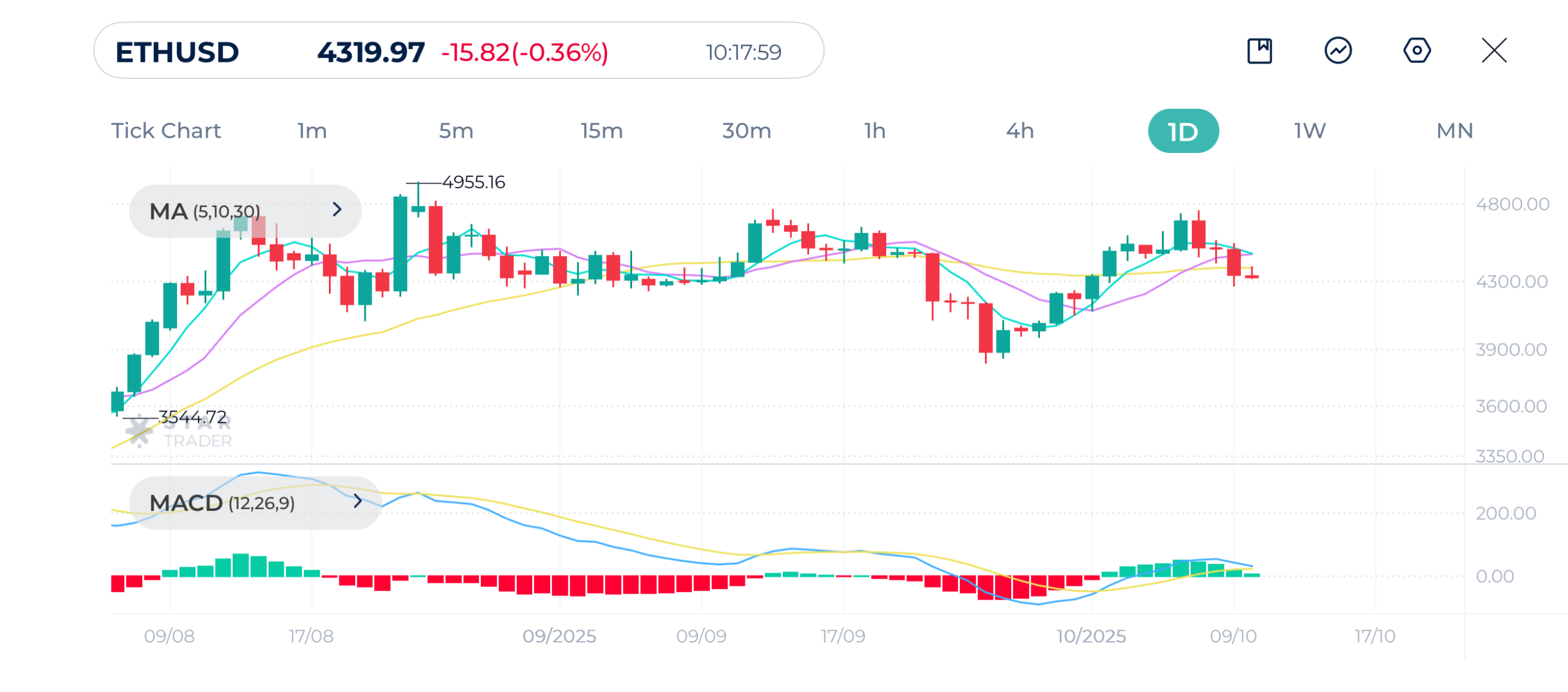 ETH/USD(イーサリアム/ドル)は$4,750のレジスタンスを上抜けられず、下落反転の兆候を示した。5日線と10日線のデッドクロス(Bearish Crossover)が発生し、短期的な下向きトレンドに転じている。